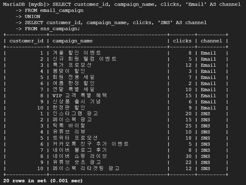 --> 테이블 email_campaign의 customer_id, campaign_name 데이터와 'Email' 문자열을 channel이라는 새로 추가한 컬럼으로 구성된 테이블과 테이블 sns_campaign의 customer_id, campaign_name 데이터와 'SNS' 문자열을 channel이라는 새로 추가한 컬럼으로 구성된 테이블을 UNION으로 통합하여 이메일과 SNS 캠페인의 성과 데이터를 하나의 테이블로 통합하여 비교 분석.