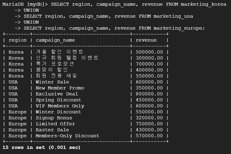 --> 테이블 marketing_korea, marketing_usa, marketing_europe 각각의 region, campaign_name, revenue 데이터를 UNION으로 통합 조회하여 국가별 마케팅 성과 및 전략을 평가. *이때 UNION으로 통합되려면 컬럼명과 컬럼수가 같아야 함.