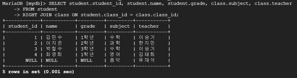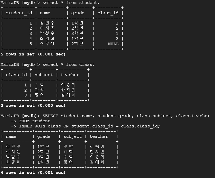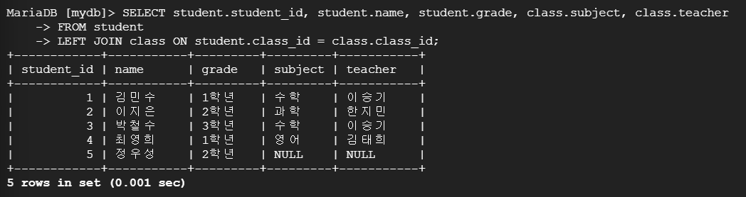 CREATE TABLE student ( student_id INT AUTO_INCREMENT PRIMARY KEY, name VARCHAR(50), grade VARCHAR(50), class_id INT, FOREIGN KEY (class_id) REFERENCES class(class_id) ON DELETE CASCADE ); INSERT INTO student (name, grade, class_id) VALUES ('김민수', '1학년', 1), ('이지은', '2학년', 2), ('박철수', '3학년', 1), ('최영희', '1학년', 3), ('정우성', '2학년', NULL); CREATE TABLE class ( class_id INT AUTO_INCREMENT PRIMARY KEY, subject VARCHAR(50), teacher VARCHAR(50) ); INSERT INTO class (subject, teacher) VALUES ('수학', '이승기'), ('과학', '한지민'), ('영어', '김태희');