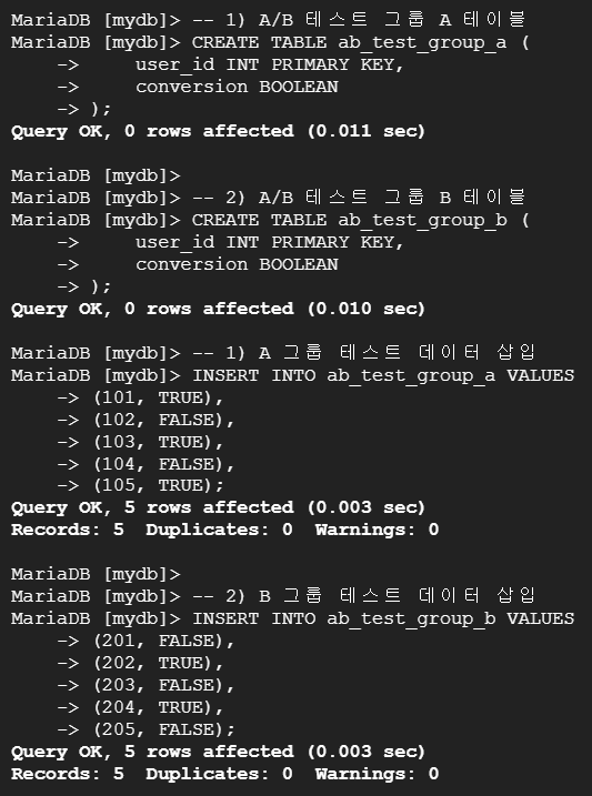--> 테이블 ab_test_group_a, ab_test_group_b의 user_id, conversion 데이터와 각각 'Group A', 'Group B'라는 문자열을 test_group이라는 새로운 컬럼으로 추가하여 UNION을 활용해 A/B 테스트 그룹 데이터를 하나의 테이블로 결합하여 비교 분석.