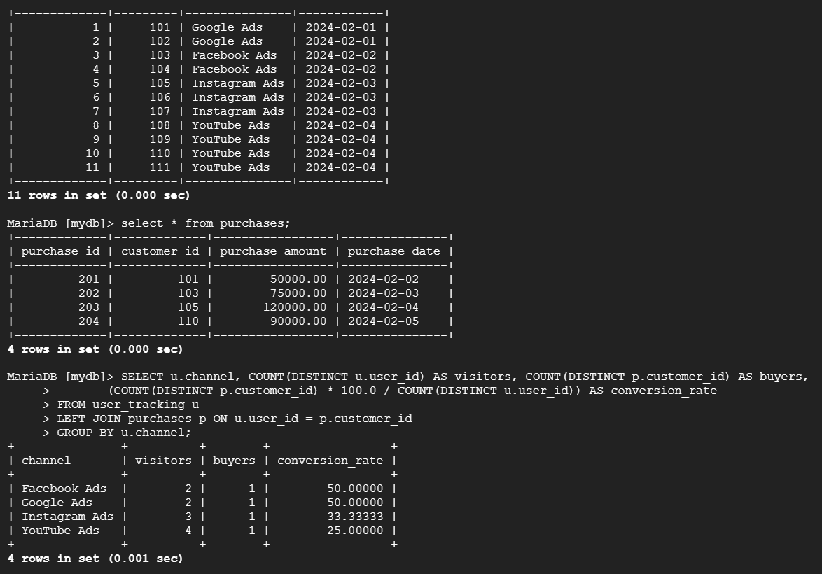 --> 테이블 user_trcking(LEFT)에 테이블 purchases를 user_id(user_tracking)과 customer_id(purchases)를 기준으로 조인. 이때 user_tracking 테이블의 user_id의 수를 중복 없이 센 값을 visitors로, purchases 테이블의 customers의 수를 중복 없이 센 값을 buyers로 명명하여 조회할 컬럼 추가. 같은 channel의 데이터는 묶어 출력하도록 하여 각 유입 채널의 전환율 분석.