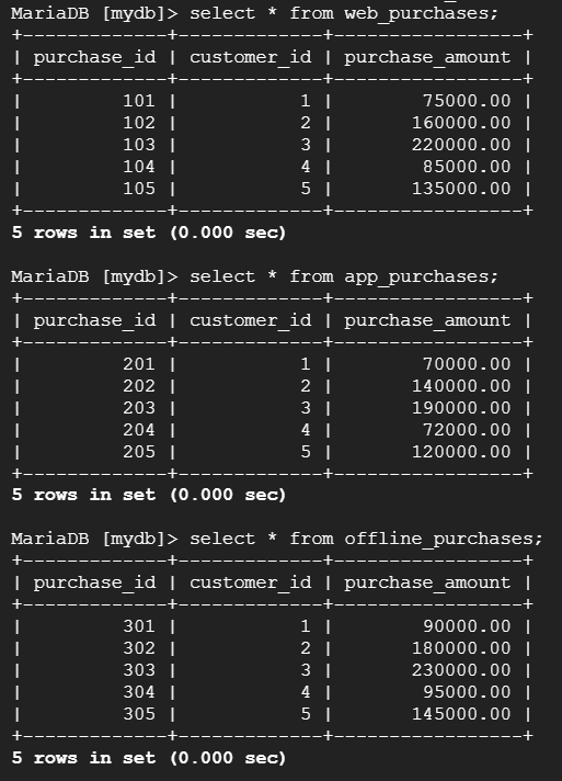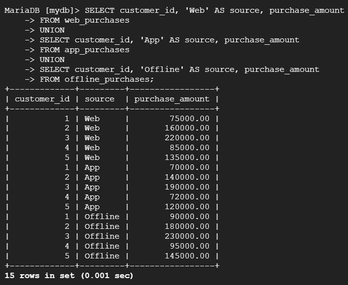 --> 테이블 web_purchases, app_purchases, offline_purchases 각각의 purchase_amount와 각각 'Web', "App', 'Offline'이라는 문자열로 구성된 source라는 새로운 컬럼을 추가하여 UNION을 활용한 데이터 통합 조회로 고객별 구매 경로 분석.