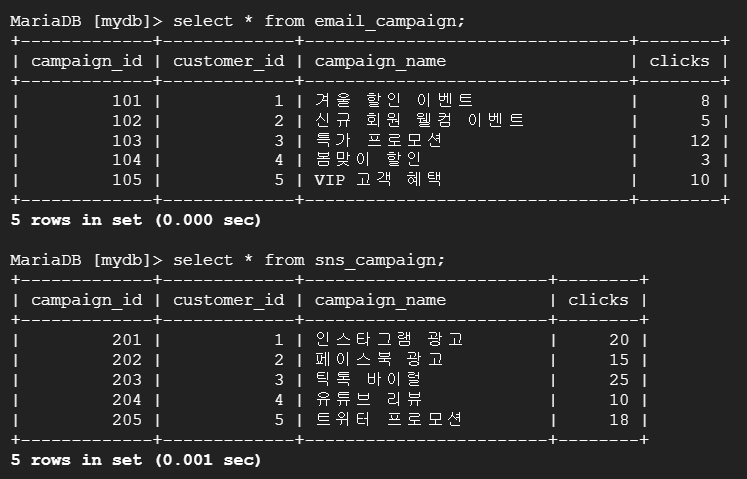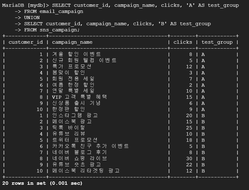 --> 테이블 email_campaign의 customer_id, campaign_name 데이터와 'Email' 문자열을 channel이라는 새로 추가한 컬럼으로 구성된 테이블과 테이블 sns_campaign의 customer_id, campaign_name 데이터와 'SNS' 문자열을 channel이라는 새로 추가한 컬럼으로 구성된 테이블을 UNION으로 통합하여 이메일과 SNS 캠페인의 성과 데이터를 하나의 테이블로 통합하여 비교 분석.
