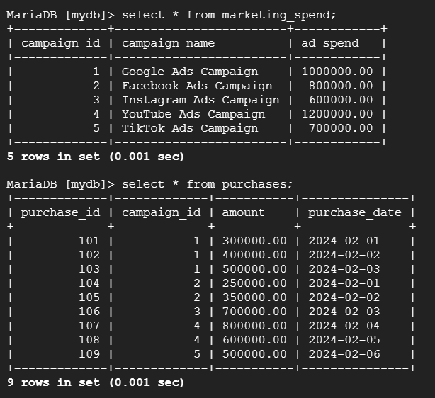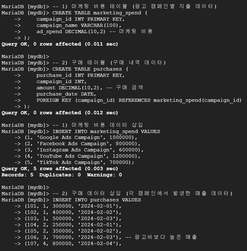 --> 테이블 marketing_spend (별칭 m, left)에 테이블 purchases (별칭 p, right)를 각 테이블의 campaign_id를 기준으로 조인하여 marketing_spend의 campaign_name, ad_spend 데이터(각각 같은 데이터끼리 그룹화)와 purchases의 amount의 총합을 total_revenue로 컬럼 추가하여 조회.