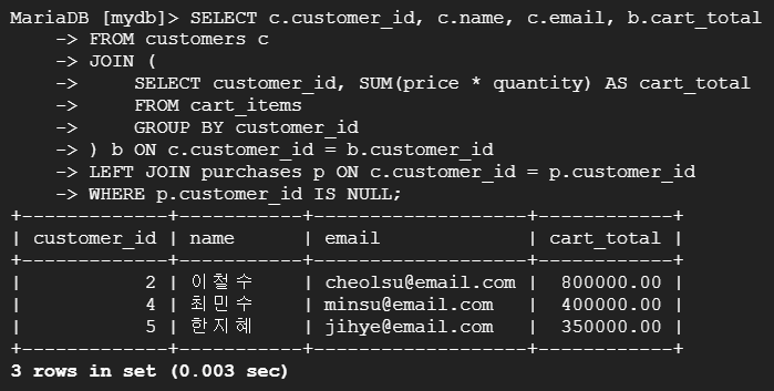 --> 먼저 테이블 customers(별칭 c) 전체 데이터와 테이블 cart_items의 customer_id와 cart_total(price와 quantity를 곱한 값의 총합)을 같은 customer_id 별로 묶은 테이블(별칭 b)을 각 테이블의 customer_id를 기준으로 조인. 이 데이터(LEFT)에 테이블 purchses(별칭 p, RIGHT)를 마찬가지로 각 테이블의 customer_id를 기준으로 조인하고, 이때 p의 customer_id 값이 NULL인 것만 sort하여 장바구니에 상품을 담았지만 구매하지 않은 고객을 식별하여 리마케팅 대상 선정.