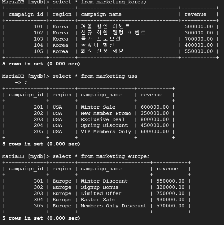 --> 테이블 marketing_korea, marketing_usa, marketing_europe 각각의 region, campaign_name, revenue 데이터를 UNION으로 통합 조회하여 국가별 마케팅 성과 및 전략을 평가. *이때 UNION으로 통합되려면 컬럼명과 컬럼수가 같아야 함.