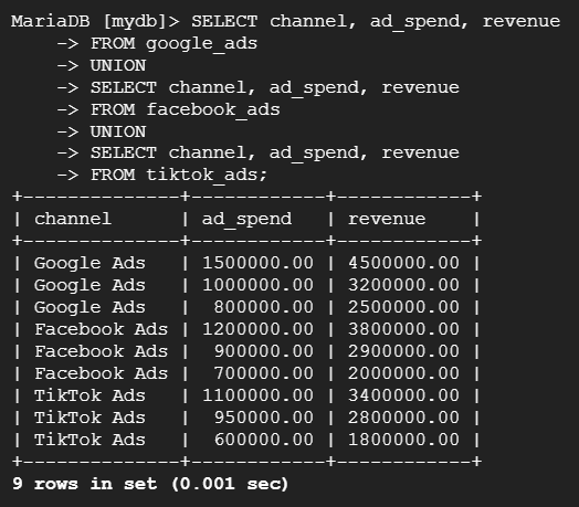 --> 테이블 google_ads, facebook_ads, tiktok_ads 각각의 channel, ad_spend, revenue 데이터를 UNION으로 통합 조회하여 마케팅 채널별 ROI 종합 평가 분석.